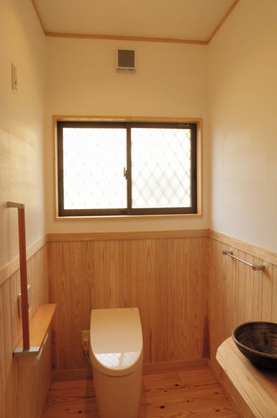 陶器瓦の切妻屋根に外壁は塗り壁、大きな化粧梁のある玄関が印象的な建物です。内装には無垢材を多用し仕上げてあります。居間に隣接する和室は10畳間です。これに付け書院を設け天井は無垢の格天井としてあります。居間は堀こたつと床暖房を設け、天井高さも2.70mととてもゆとりある空間となりました。( 日置市 )