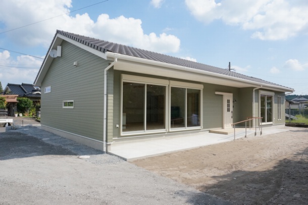 2世帯住宅で、玄関を入ると左右に親世帯と子世帯で4世代の暮らす平屋住宅です。特に子世帯のLDKは4間×3間とかなり広々としています。浴室と脱衣室は共有のほど良い距離感で、それぞれに大型のウォークインクローゼットを備え収納もたっぷりです。たくさんのお友達が集まるLDKのキッチンは大工の手造りで施主様のお気に入りとなっています。( 南九州市 )